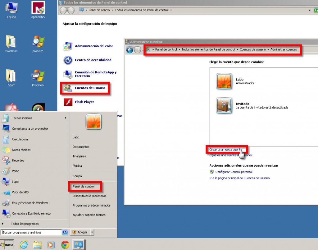 Se debe ingresar al Panel de Control y allí en el ícono "Cuentas de usuarios". Una vez dentro se debe acceder a Administrar cuentas y desde ahí se podrá crear una. A continuación veremos un ejemplo con una captura de pantalla: