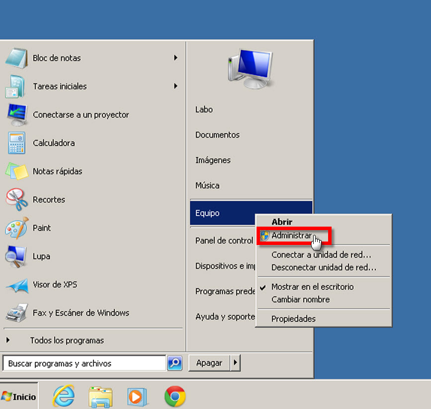 Sin embargo existe otra alternativa, la cual usaremos para administrar no solo usuarios, sino también grupos. Puede crearse desde el menú Administrar, al cual se accede mediante clic con el botón derecho sobre el ícono "Mi PC" o "Equipo" como se muestra en la siguiente captura: