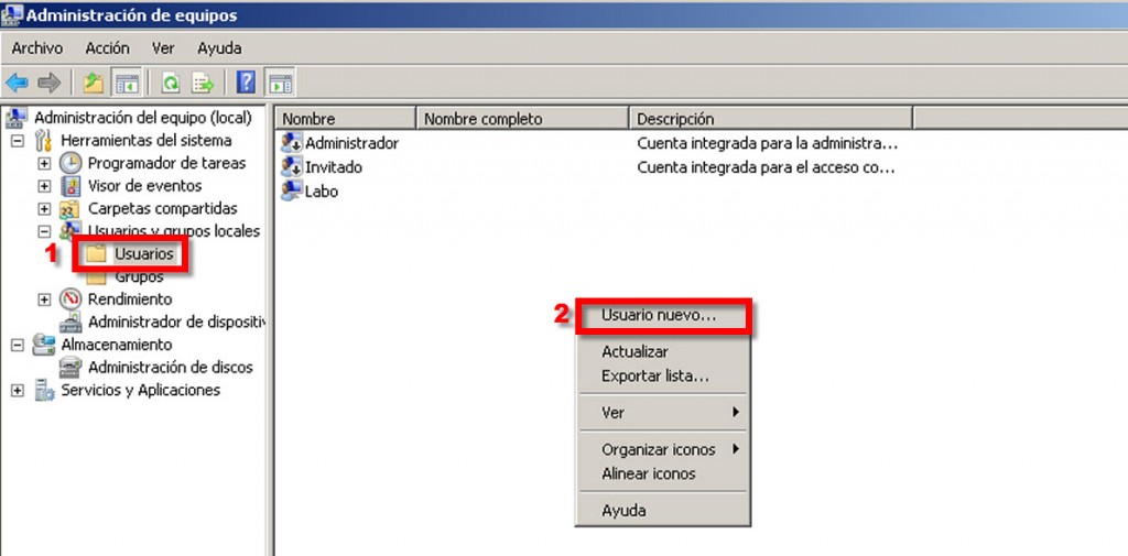Una vez dentro del menú solo basta ir a la carpeta de usuarios para crear uno nuevo. En la siguiente captura veremos cómo hacerlo: