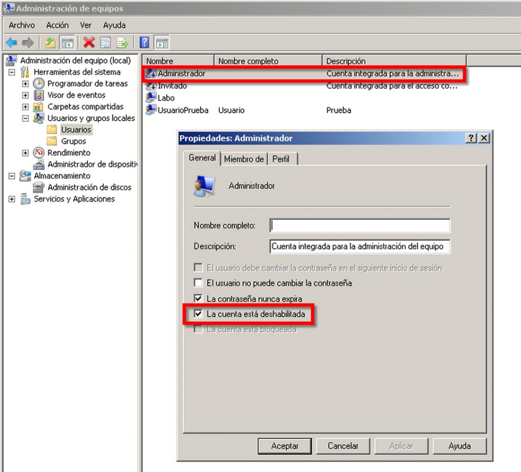 Es muy importante habilitar el Administrador antes de quitar permisos, ya que una vez hechos los cambios, de requerir permisos de este tipo, simplemente no se tendrán. Por eso es recomendable habilitarlo y definir una contraseña fuerte y robusta. Para habilitar esta cuenta Administrador, basta con acceder al mismo y desmarcar "La cuenta está deshabilitada" como se muestra a continuación: