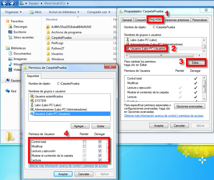Una vez creadas las respectivas sesiones para cada persona que usará la computadora, como Administrador, se pueden definir los permisos en diferentes directorios para tener (o denegar) acceso de escritura o lectura. En esta parte veremos cómo restringir a los invitados, para que no puedan crear ni modificar archivos en un determinado directorio dentro del disco C (raíz).