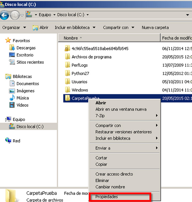 Para esto se debe hacer clic con el botón derecho en el directorio a modificar los permisos, en este caso lo haremos con la carpeta llamada "CarpetaPrueba" dentro disco C. Una vez desplegado el menú, debe accederse a Propiedades tal como lo muestra la siguiente captura de pantalla: